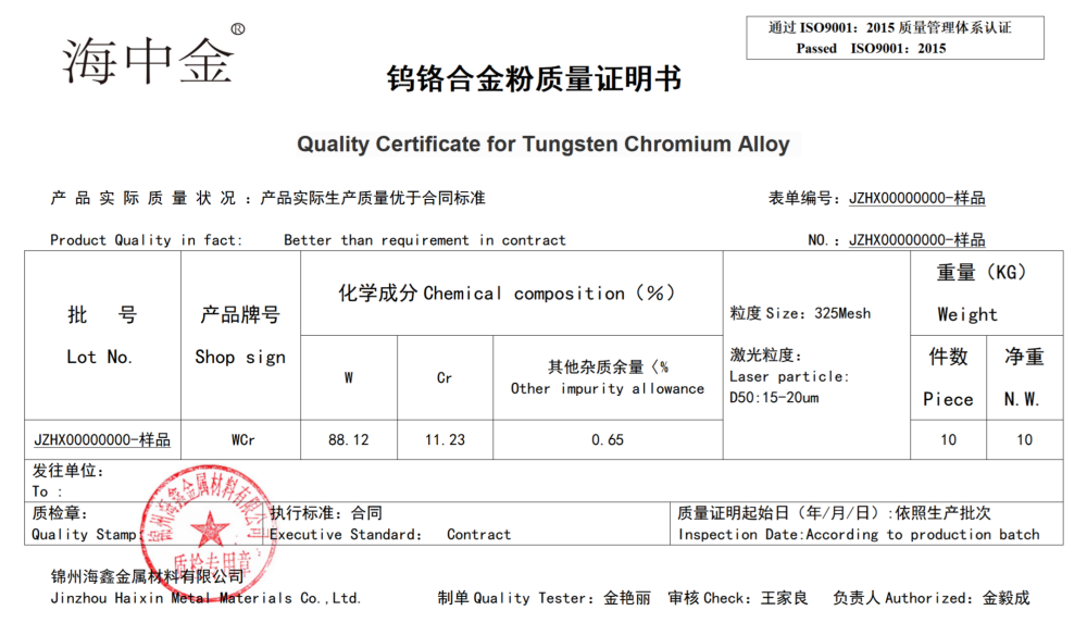 產(chǎn)品名稱:鎢鉻(WCr) 規(guī)格:100目、200目、325目   形貌:不規(guī)則 顏色:銀灰色  特點(diǎn):具有優(yōu)異的耐熱性能,穩(wěn)定性,耐高溫,耐酸堿,抗熱震。 用途:鎢鉻合金力學(xué)性能好,應(yīng)用最廣,主要制造冷剪金屬的刀片、鏟搓螺紋板的鏟刀、大型重載冷鐓沖頭、中載鋼板穿孔沖頭、風(fēng)動(dòng)工具及精壓模冷沖栽和切邊用模具等。